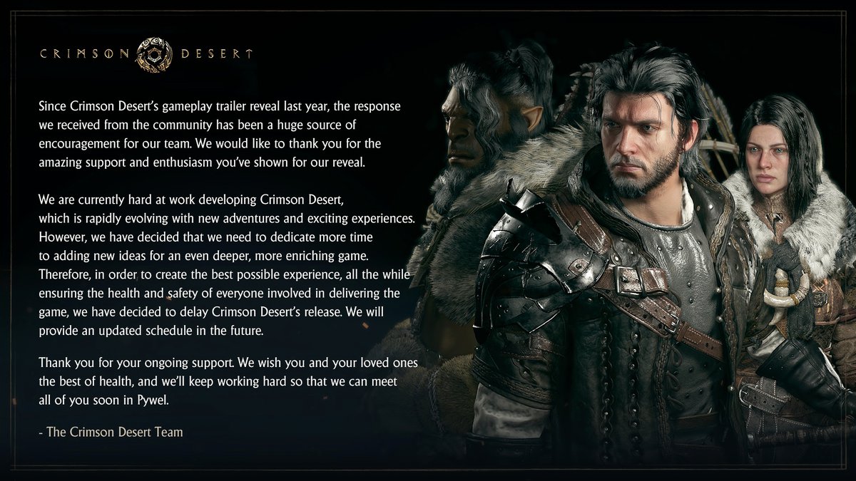 Разработка игры продолжается, о ее статусе Pearl Abyss не сообщает. Известно лишь, что дополнительное время поможет разработчикам сделать Crimson Desert глубже и богаче, реализовав новые идеи.