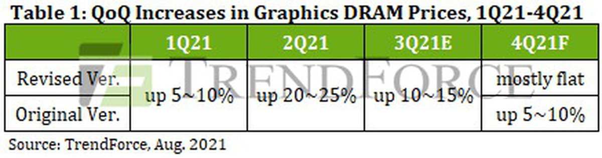 Рост цен на видеопамять будет не таким активным, как предполагалось, пишут аналитики исследовательской компании TrendForce. Аналитики пересмотрели прогноз на 2021 год после коррекции на рынке криптовалют.