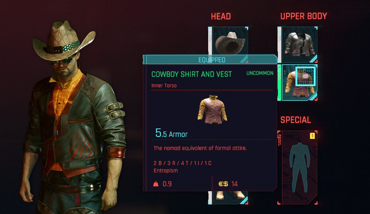 К примеру, снаряжение нетраннера увеличивает Интеллект, но почти не повлияет на Силу и другие параметры. Броня корпорации Arasaka, напротив, увеличит Силу и Реакцию, не особо затронув другие характеристики.