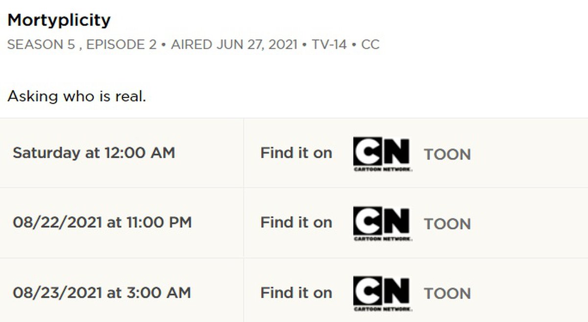 Обычный слот «Рика и Морти» 16 августа будет занят мультсериалом «Тука и Берти», затем вместо новой серии планируется показать повтор. 22 и 23 августа на Adult Swim будут крутить Mortyplicity, второй эпизод пятого сезона.