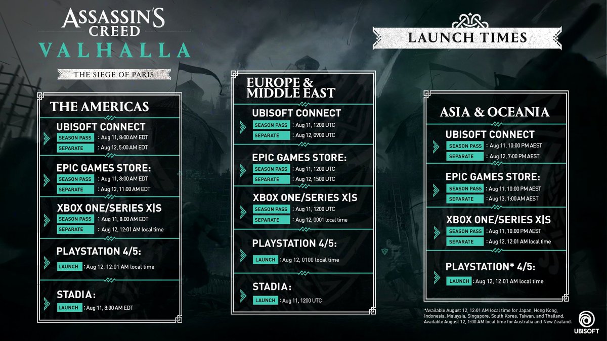 12 августа состоится релиз «Осады Парижа», второго сюжетного дополнения к Assassin’s Creed Valhalla. Разработчики опубликовали памятку с временем релиза аддона в разных регионах и на разных платформах.