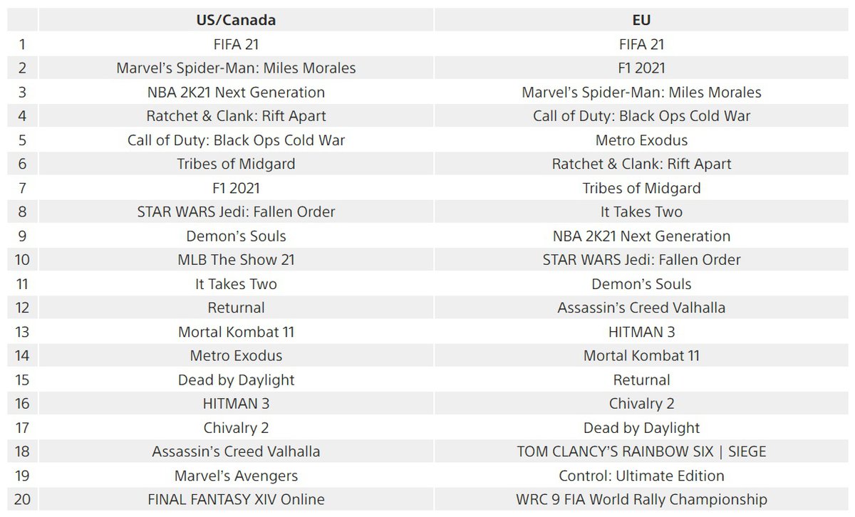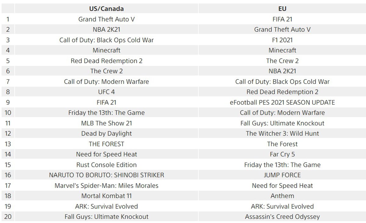 Лидерами среди игр для PlayStation 4 стали Grand Theft Auto 5 (Америка) и FIFA 21 (Европа). На PlayStation 5 чарты обоих регионов возглавляет FIFA 21.
