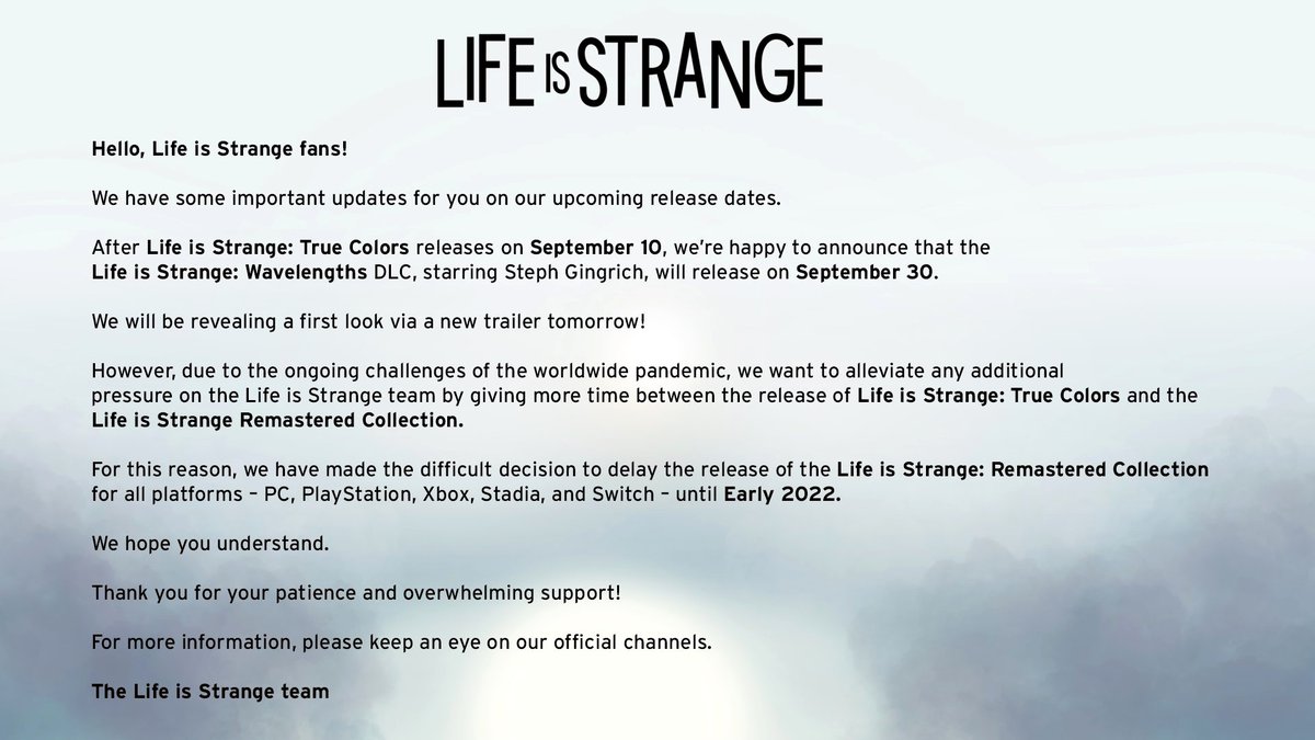 Перенос объясняется нежеланием команды излишне перенапрягаться во время пандемии. Релиз Life is Strange Remastered Collection должен был состояться всего через несколько недель после Life is Strange True Colors, новой части серии.