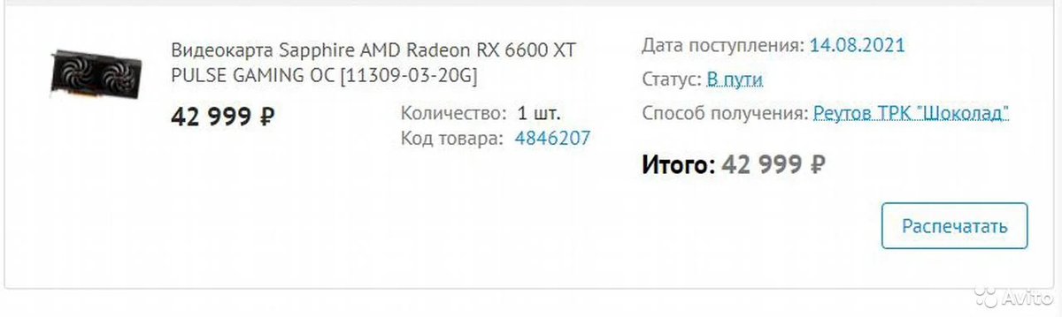 В то же время Radeon RX 6600 XT стали появляться на Avito. Значительная часть перепродавцов еще не успела получить свои карты: на страницах лотов выкладывают не фотографии карт, а скриншоты заказов в магазинах ритейлеров.