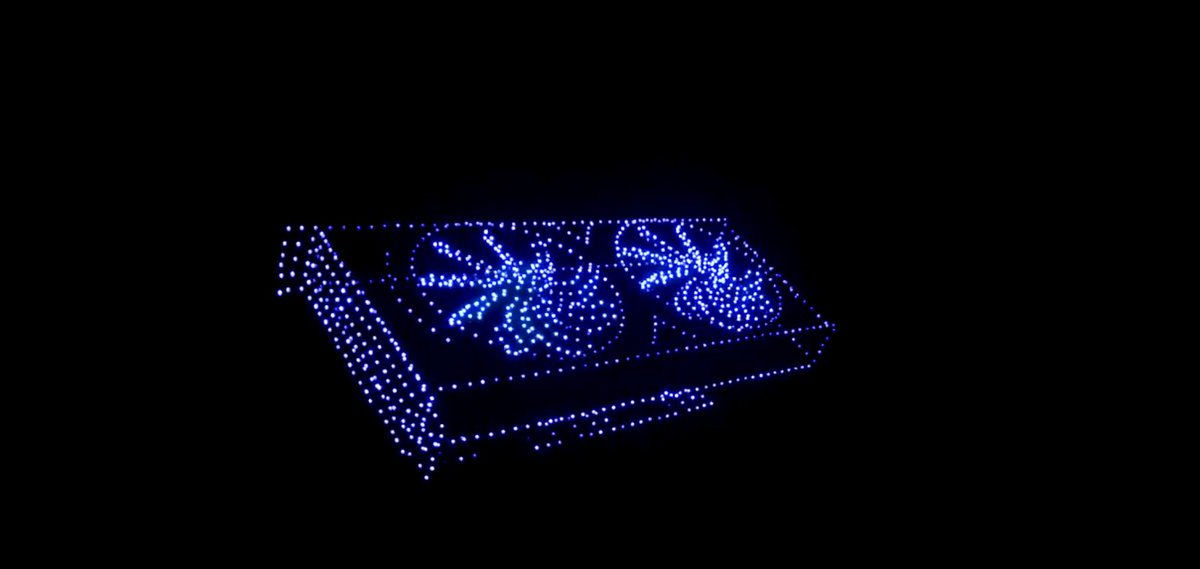Из дронов собрался контур видеокарты достаточно простого дизайна, с двумя большими вентиляторами. Примечательно, что примерно так же выглядел прототип видеокарты Intel, показанный инсайдером Moore’s Law is Dead.