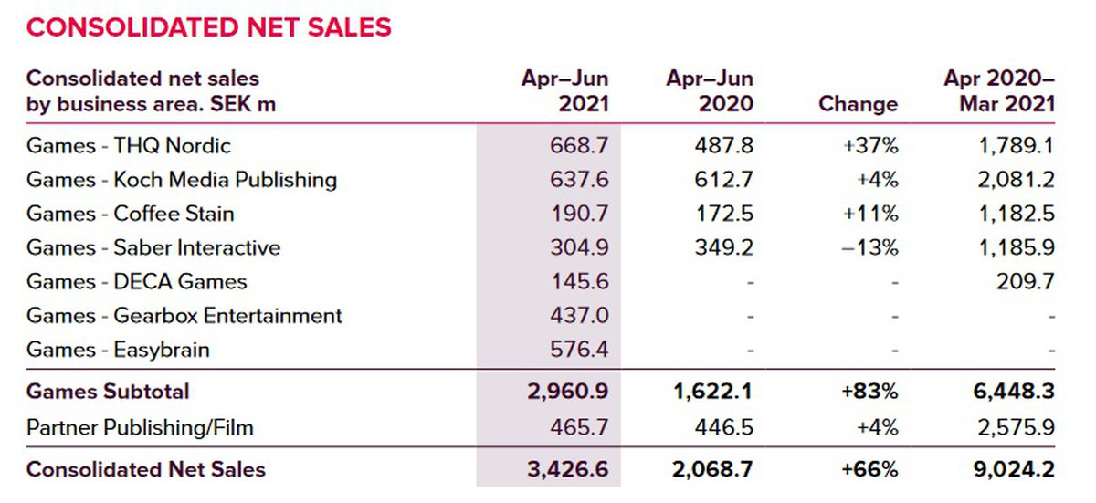 Холдинг Embracer Group отчитался за первый квартал нынешнего финансового года. Выручка компании по сравнению с прошлым годом выросла на 66%, операционная прибыль увеличилась на 79%, до $147 миллионов.