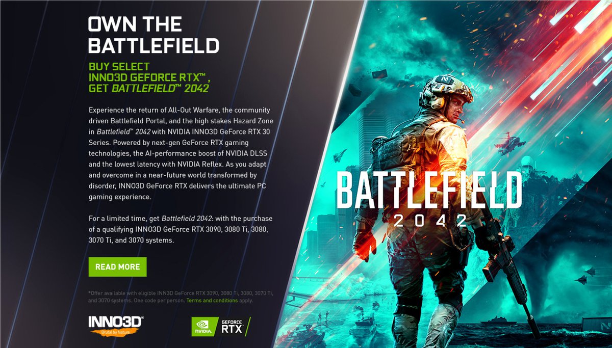 Судя по промо-сайту Inno3D, получить Battlefield 2042 смогут покупатели GeForce RTX 3090, RTX 3080 Ti, RTX 3080. RTX 3070 Ti и RTX 3070. На младшие RTX 3060 Ti и RTX 3060 предложение, видимо, не распространяется.