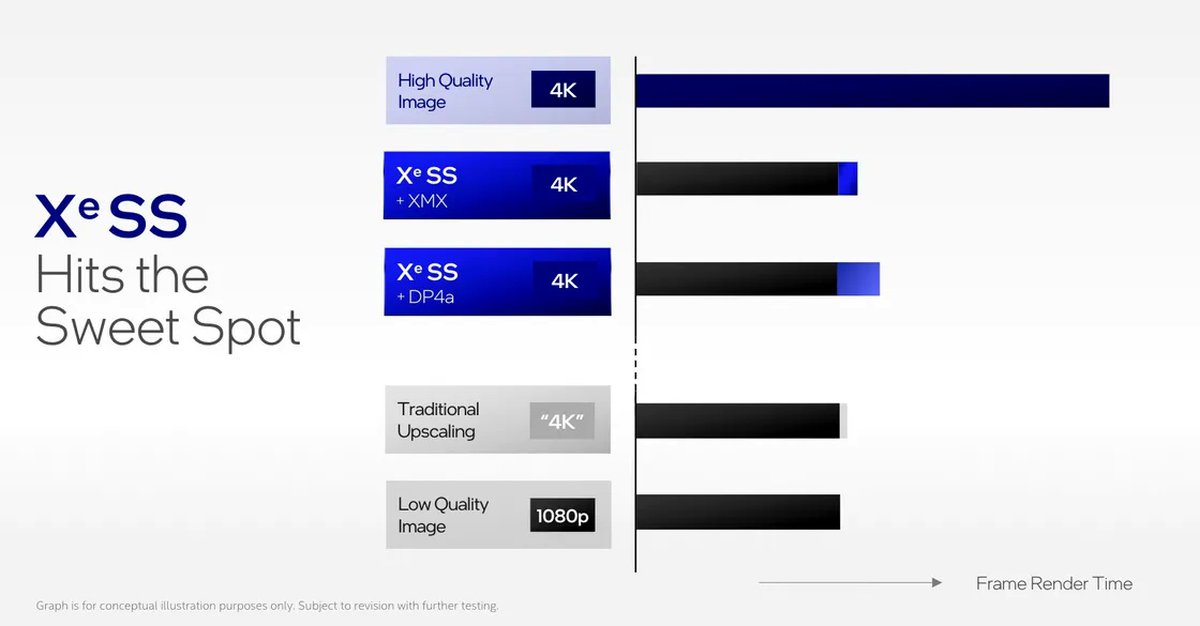 Судя по презентации Intel, при апскейле с разрешения 1080p до 4К суперсэмплинг XeSS работает чуть медленнее традиционного апскейла. В то же время оверхед относительно рендеринга в 1080p невелик; картинка в полноценном 4К рендерится гораздо дольше.