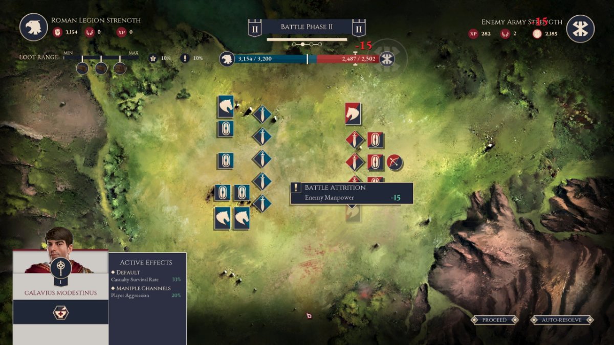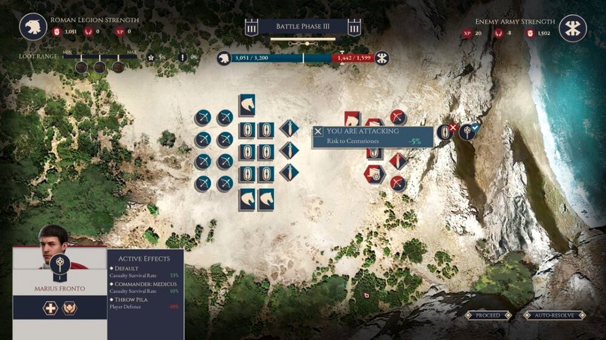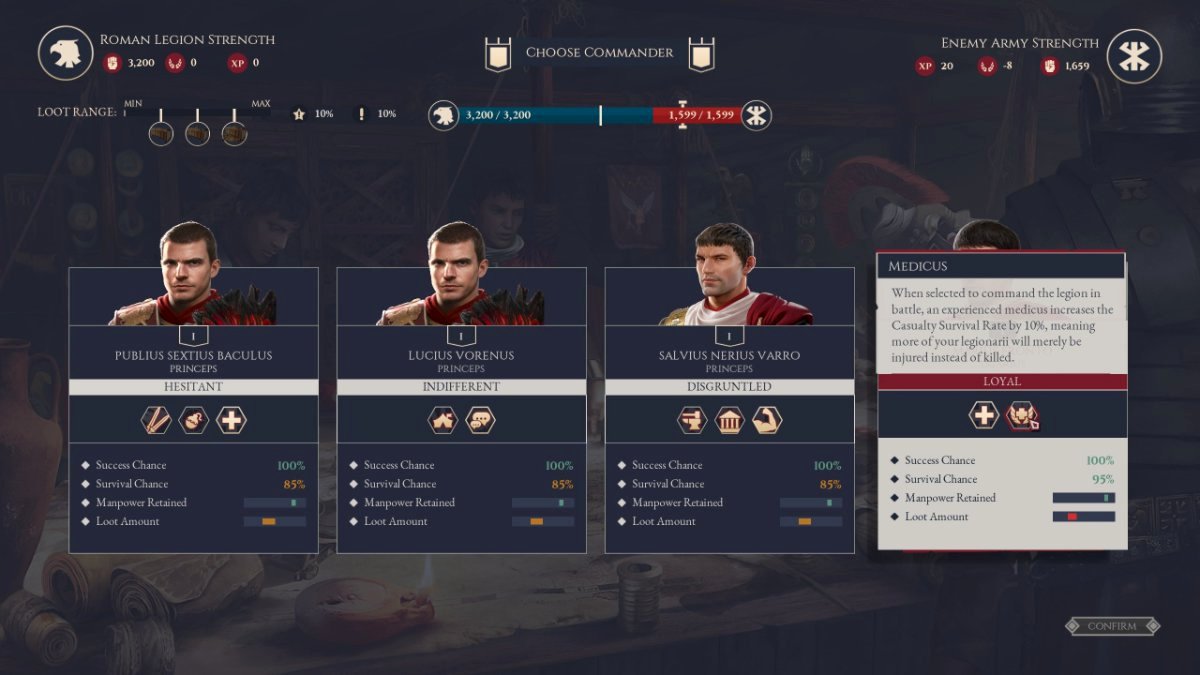 Как же регион захватить? Собственно, для этого игрок армию и держит. При отправке легиона на бой нужно выбрать, кто из преторианцев его возглавит. Многое будет зависеть от класса и качеств этого преторианца: успех или провал, кол-во потерь, что удастся награбить. Кроме этого, надо будет выбрать подходящую стратегию, или, вернее, строй. Если что, такие планы тоже в лагере разрабатываются и открываются.