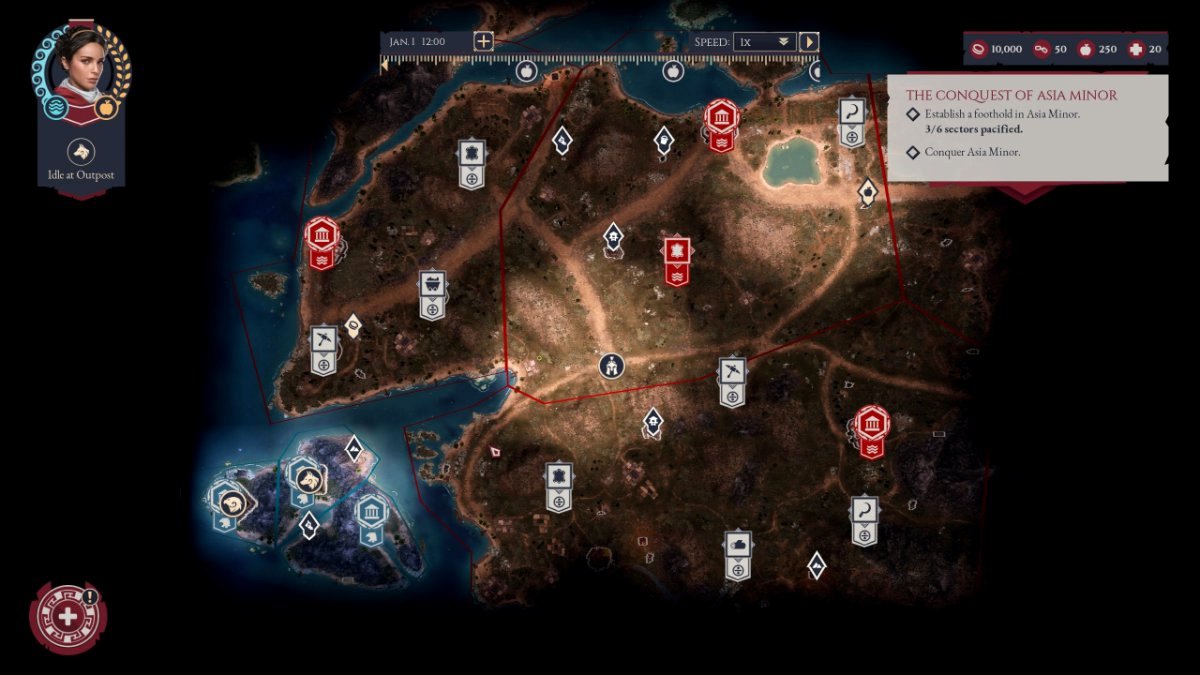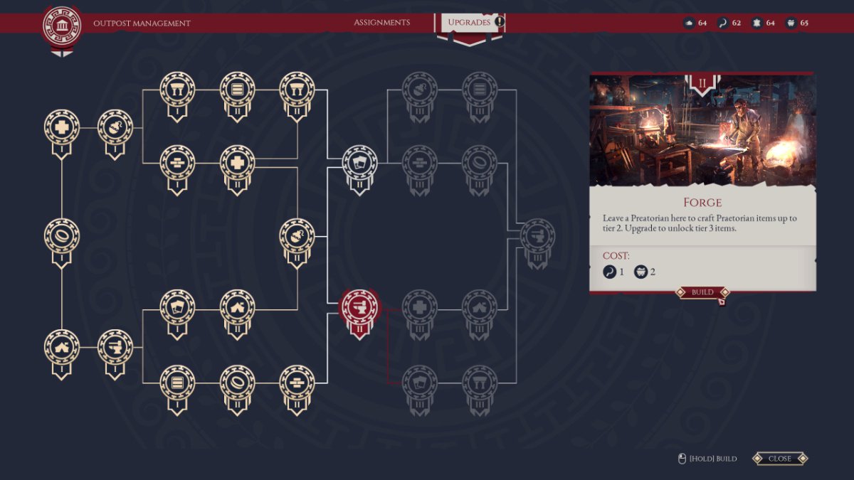 Спрашивается, зачем этим вообще заниматься? Во-первых, апгрейды лагеря позволят изготавливать снаряжение получше, а улучшение казарм позволит нанимать преторианцев более высокого уровня, если кто-то из отряда уйдёт, не согласившись с решением игрока или умрёт. Во-вторых, там же есть полевой лазарет, удобно будет иметь его в регионе текущего местонахождения.