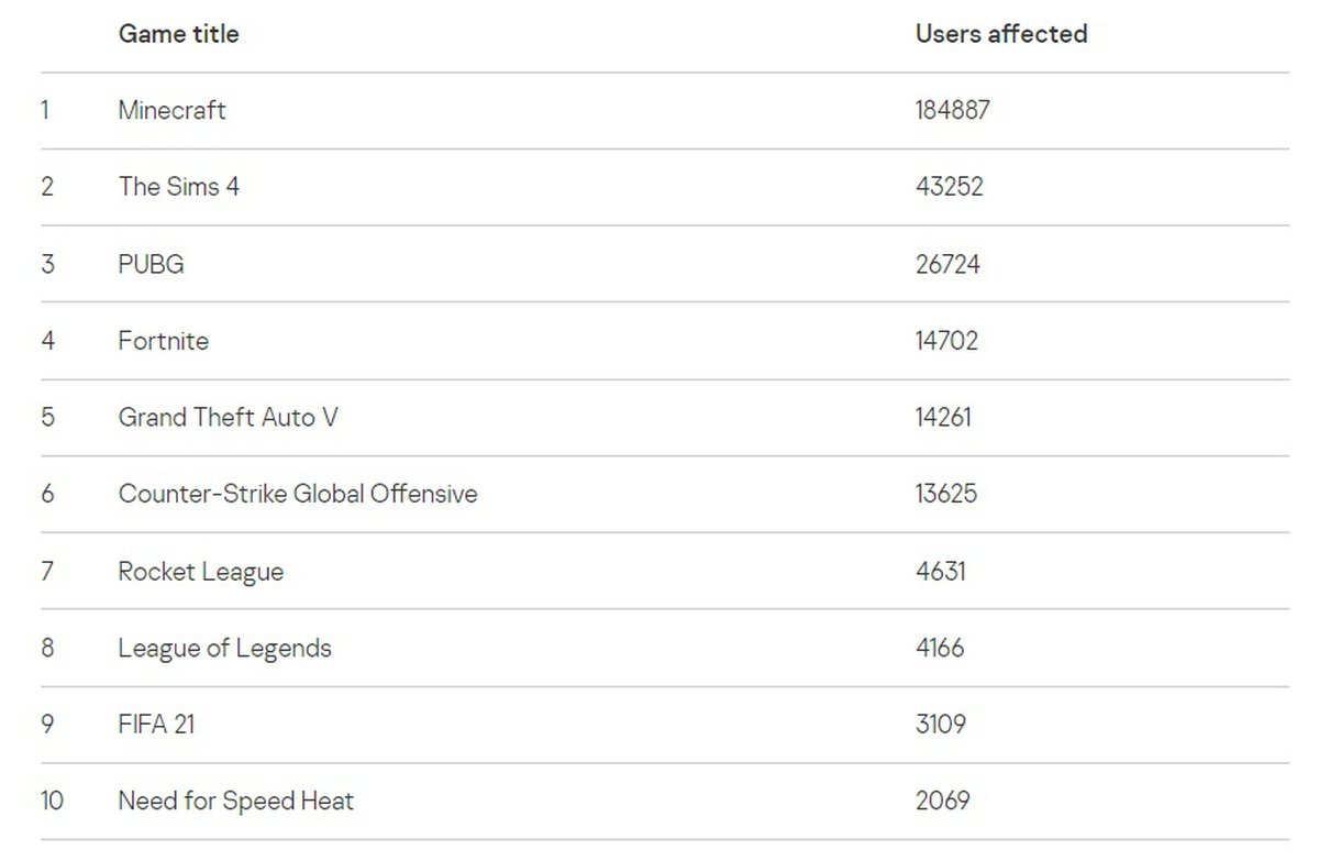 Лидером рейтинга оказалась Minecraft. Свыше 184 тысяч пользователей столкнулись с атаками, при которых вредоносное ПО пыталось выдать себя за Minecraft. Это больше, чем у всех остальных игр в топ-10. Также в топ попали The Sims 4, PUBG и Fortnite.
