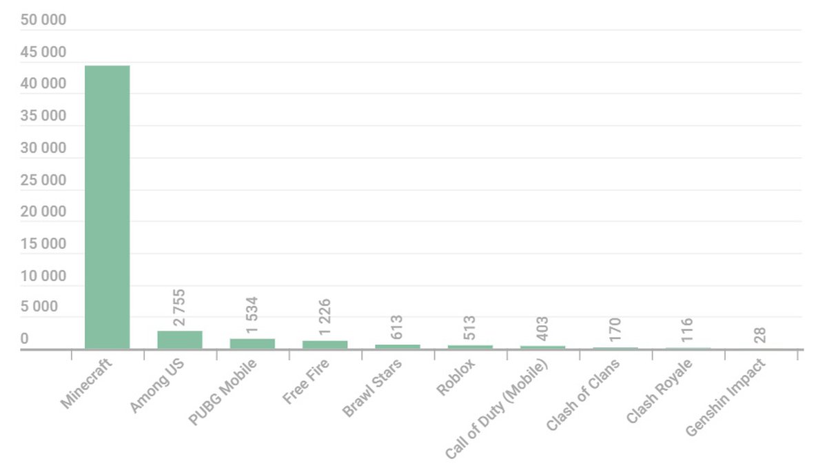 Примечательно, что на мобильных платформах популярность Minecraft еще выше. Занявшая второе место Among Us отстает почти в 20 раз.
