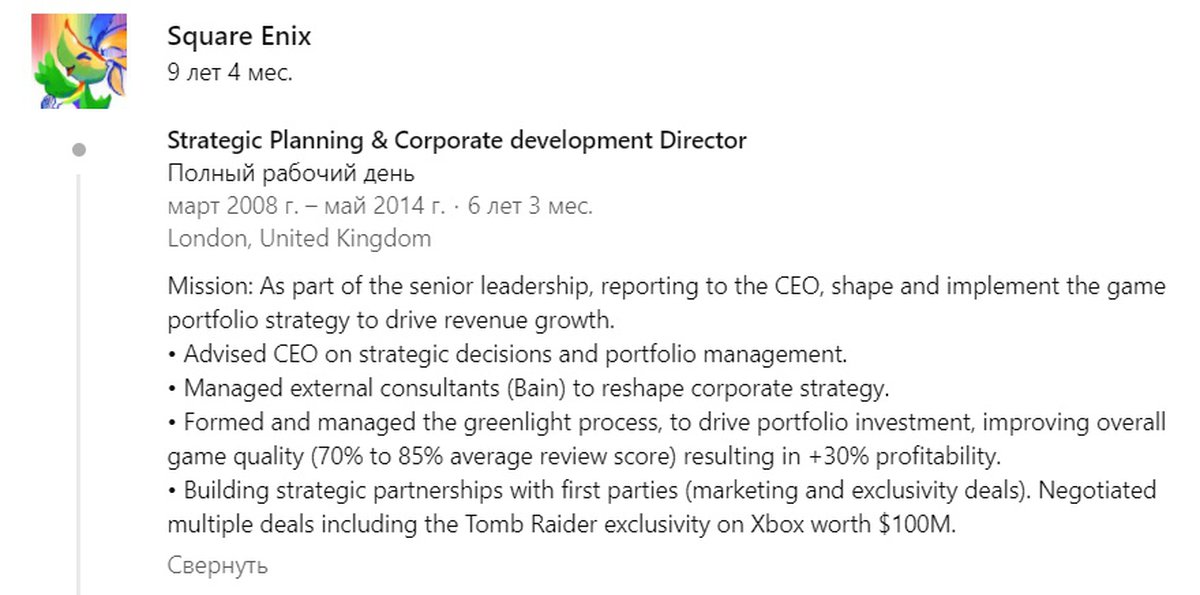 Такую цифру приводит Фабьен Россини, на момент релиза Rise of the Tomb Raider работавший в издателе игры, компании Square Enix. Согласно профилю Россини на LinkedIn, он участвовал в обсуждении сделки с Microsoft.