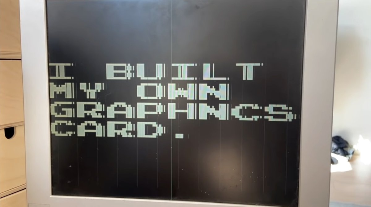 В конце концов видеокарте jdh удалось сделать то, что от нее хотел создатель: вывести на экран текст «I Built My Own Graphics Card». Вот как это выглядело.