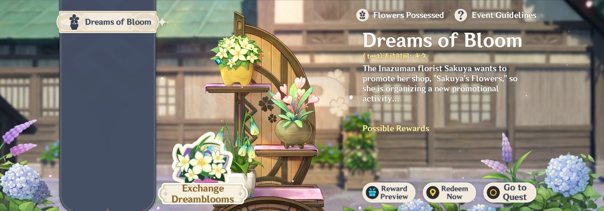 - Новое событие, Dreams of Bloom. На этот раз игрокам надо помочь флористу из Инадзумы: она хочет прорекламировать свой магазин, вам предлагается поучаствовать в промо-акции.