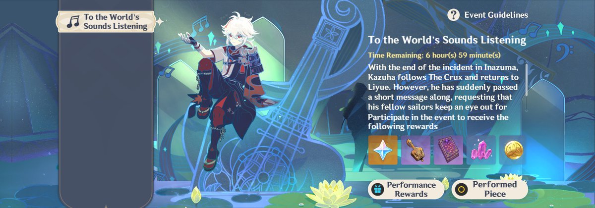 - Новое событие, To the World's Sounds Listening. После завершения основной сюжетной линии Казуха отправляется назад в Ли Юэ, но вдруг присылает короткое сообщение: товарищам предлагается не пропустить интересное мероприятие.