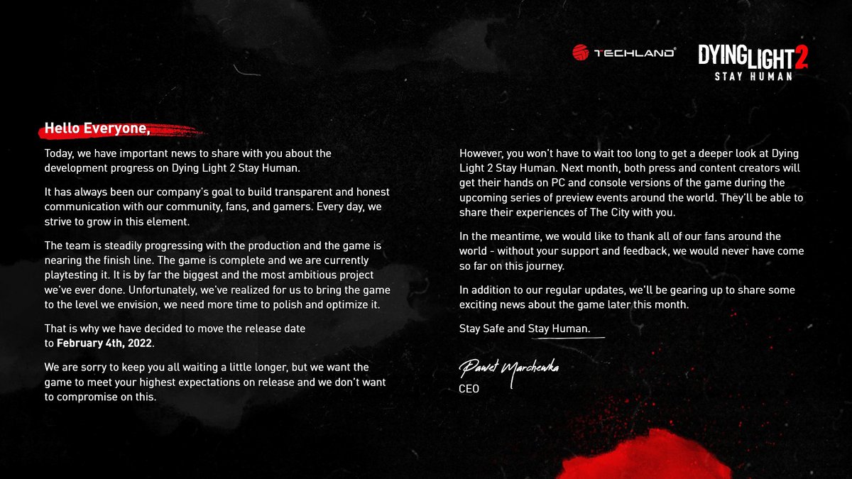 Релиз Dying Light 2 перенесен с 7 декабря 2021 года на 4 февраля 2022 года. Студия Techland решила дать команде еще два месяца на дополнительное тестирование и полировку; сама игра, подчеркивают разработчики, уже готова.