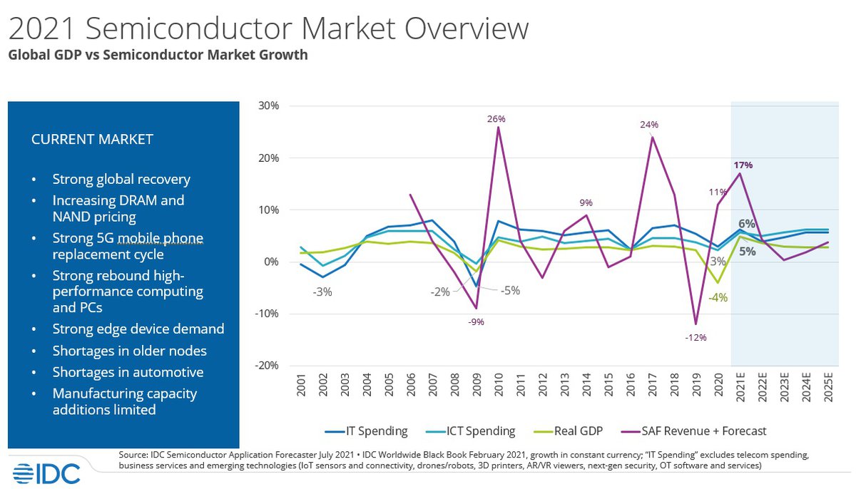 К 2025 году объем рынка полупроводников может достичь $600 миллиардов. Обычно сложившиеся рынки ежегодно растут на 3-4%, в IDC ожидают, что рынок полупроводников превзойдет этот показатель и будет расти на 5.3% в год.