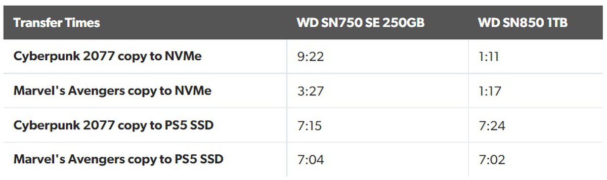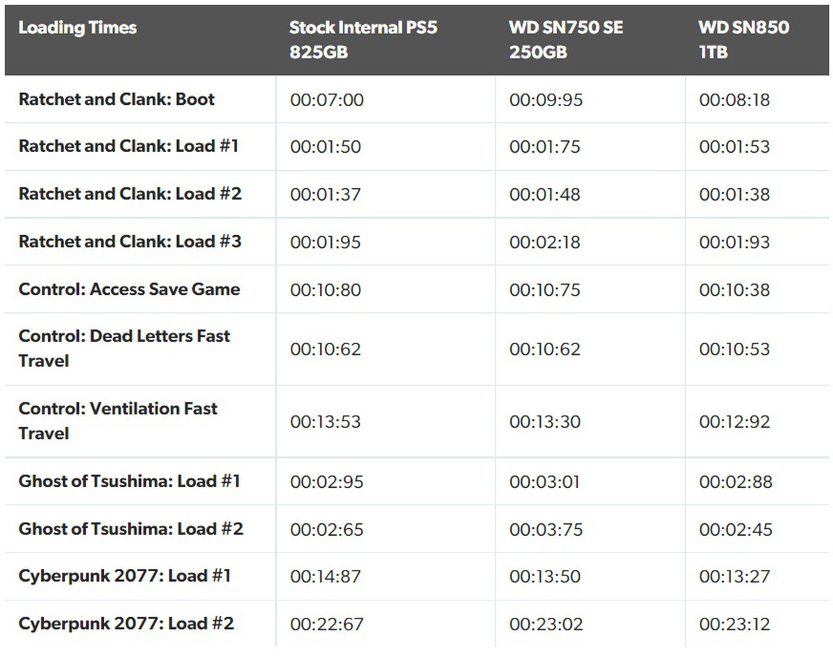 Скорость загрузки с внутреннего накопителя PlayStation 5 сравнивалась с двумя накопителями от Western Digital. Первый это WD SN850 на 1 ТБ, официально поддерживающий PlayStation 5; второй — SN750 SE на 250 ГБ, обеспечивающий скорость чтения лишь в 3200 МБ/сек.