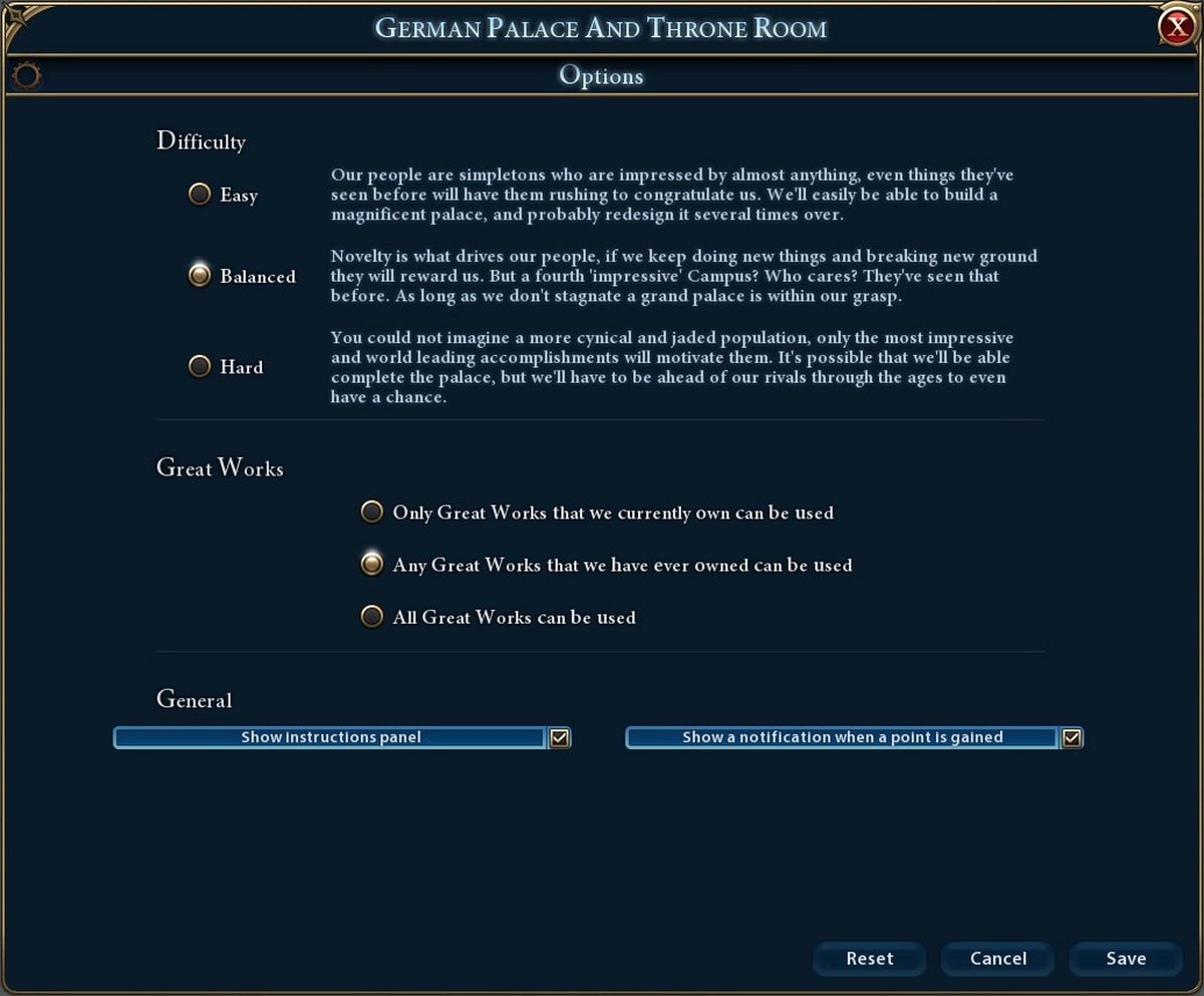 Модификация Thrones and Palaces позволяет игроку зарабатывать очки улучшений, которые можно потратить на преображение тронного зала или дворца. Очки получаются по мере развития цивилизации и зависят от уровня сложности.