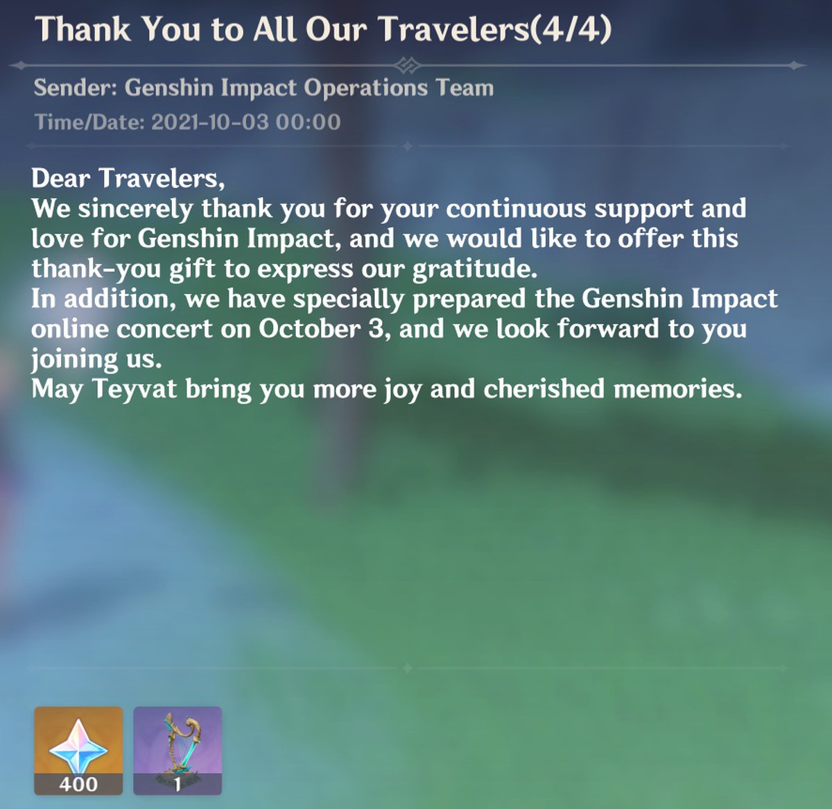 Разработчики Genshin Impact начали рассылать письма с последней из четырех незапланированных наград на годовщину игры. В финале игроки получат 400 примогемов — всего их выдали 1600 — и лиру для частного мира.