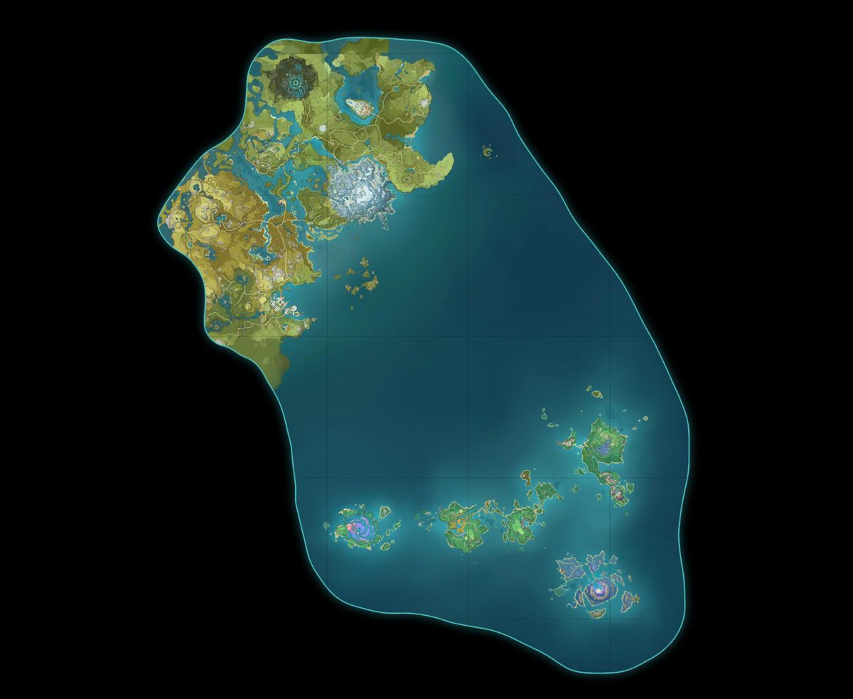Для сравнения — вот так доступный для исследования фрагмент Тейвата выглядит в нынешней версии Genshin Impact.