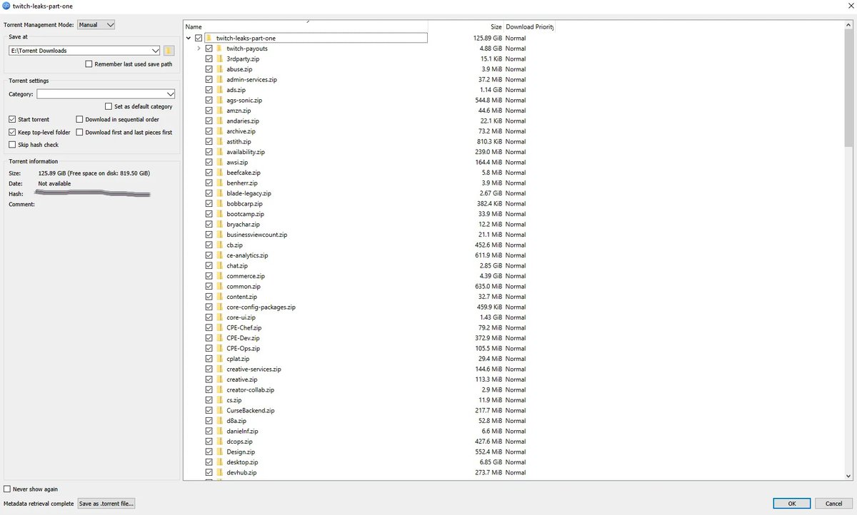 Изначально торрент-файл со слитыми данными был опубликован на 4chan. Выложивший его пользователь утверждает, что это лишь первая часть утечки. Данные якобы получены из примерно 6000 внутренних Git-репозиториев Twitch.