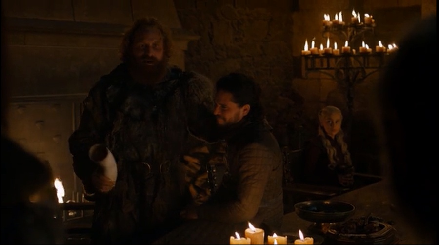 После битвы, во время пира Дейнерис заметила, с какой любовью к Джону относятся люди. На Востоке её возвеличивали, но с момента прибытия в Вестерос она то и дело видела настороженные лица в свой адрес, что не удивительно. Джон любил Дейнерис, но понимал, что она его родственница, поэтому больше не желал иметь с ней интимные отношения. Она же, боясь потерять власть, старалась сохранить с ним интим и убедить его скрыть тайну своего происхождения от всех, — даже от собственных сестёр.