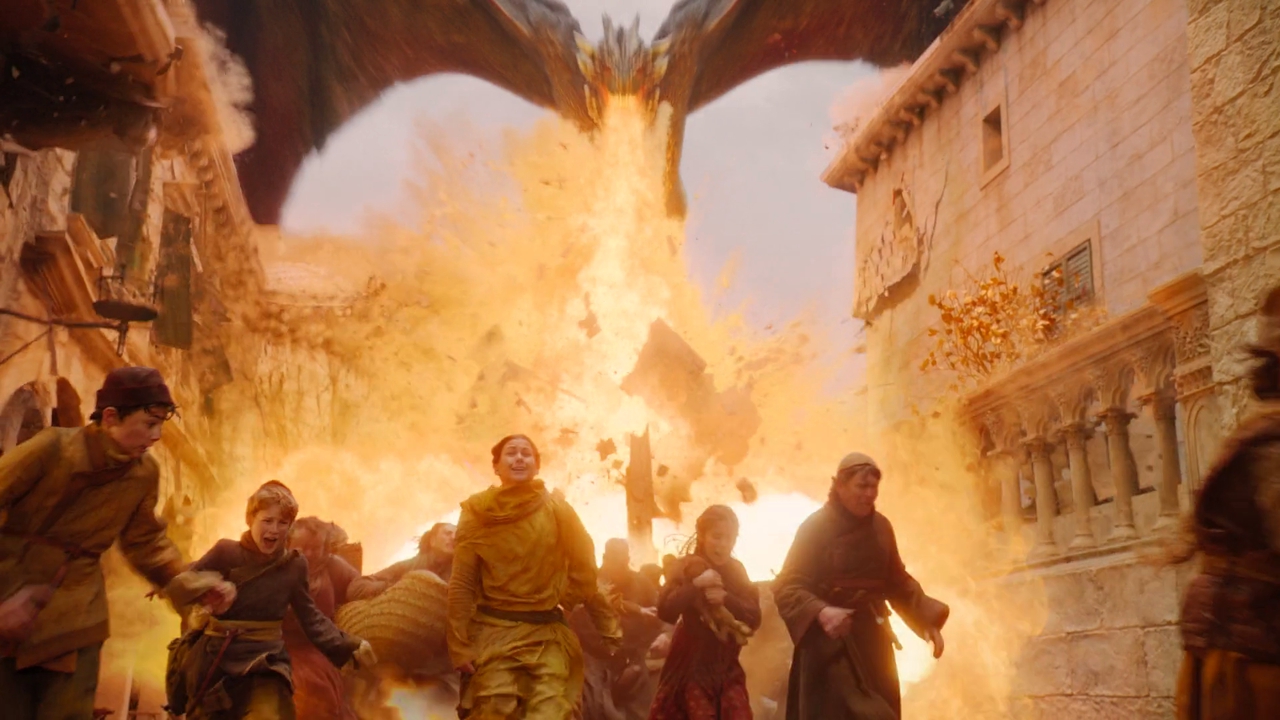 На лице Дейнерис нарисовалась ненависть и некоторая доля безумства. Она взлетела на Дрогоне и начала испускать огонь прямо на мирных жителей. Зрелище было страшнее некуда: повсюду доносились паника и крики, горели люди, дома, родители в толпе пытались найти своих детей, а они в свою очередь — родителей. Дотракийцы вернулись к своему варварскому облику и начали рубить всех, кто на глаза попадётся. «Безупречным», каждому из которых когда-то пришлось убить младенца, так же не составило труда уничтожать всё живое на своём пути. Дейнерес освободительнца оков и её величественное войско внезапно превратились в сборище бездушных убийц и чудовищ...