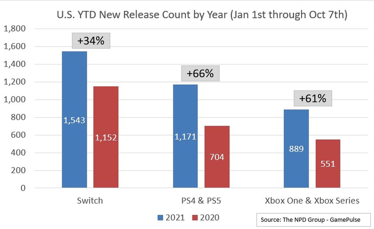 Самый большой прирост испытывает PlayStation 4 и PlayStation 5. По сравнению с прошлым годом, рассказывает аналитик Мэт Пискателла, количество релизов выросло на 66%: с 704 до 1171 игры.