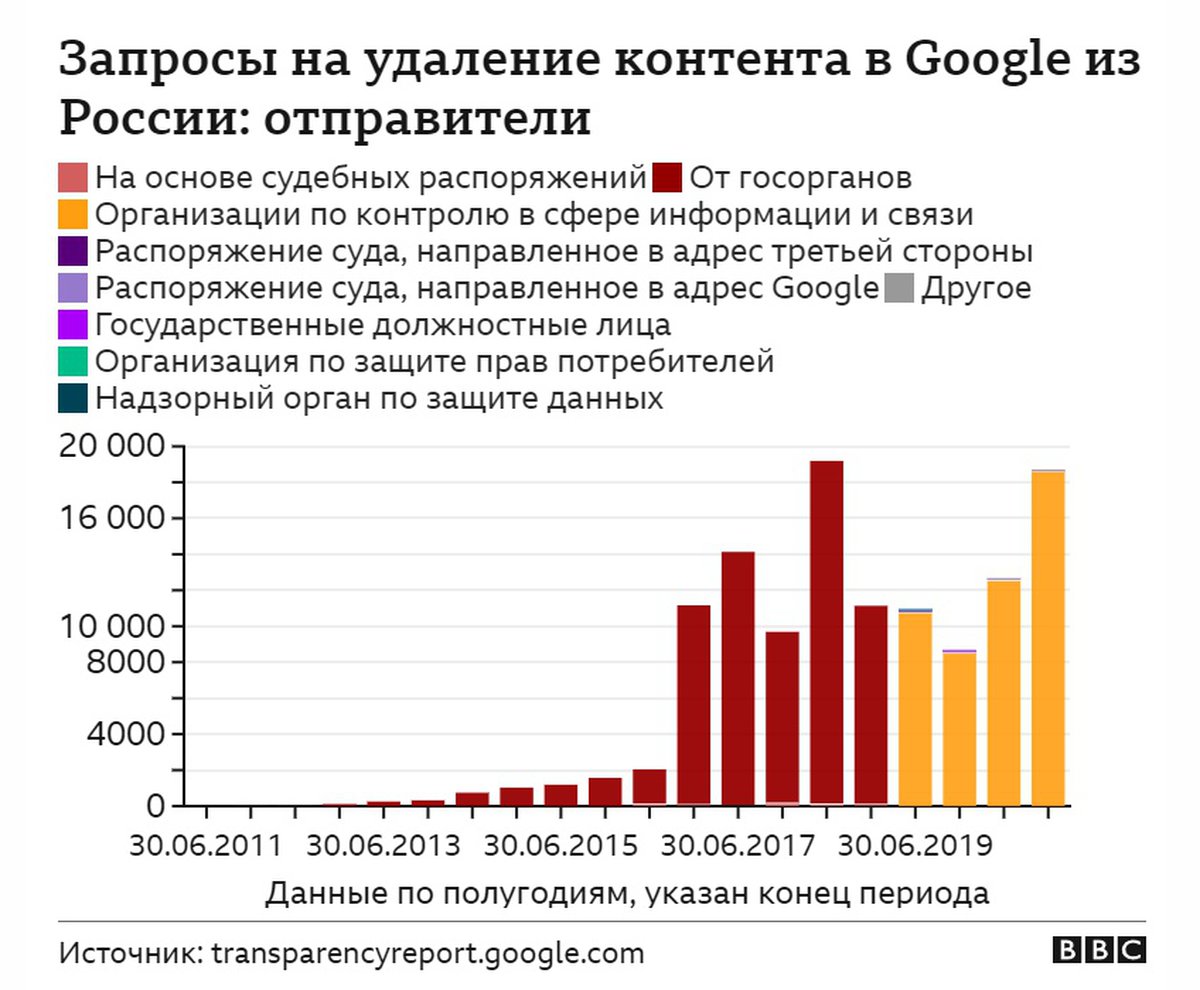 Журналисты проанализировали отчеты с 2011 по 2020 годы. Оказалось, что Россия запрашивает больше блокировок, чем все остальные страны мира, вместе взятые. Сейчас на долю России приходится 60% запросов, получаемых Google.