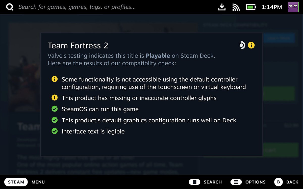 Владельцы Steam Deck смогут посмотреть статус поддержки конкретной игры. Вот так это выглядит на примере Team Fortress.