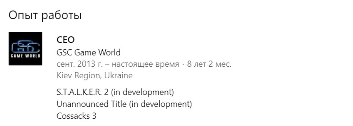 Студия GSC Game World может разрабатывать еще один проект одновременно со S.T.A.L.K.E.R. 2. Такой проект упоминается в LinkedIn-профиле Евгения Григоровича, главного исполнительного директора студии.