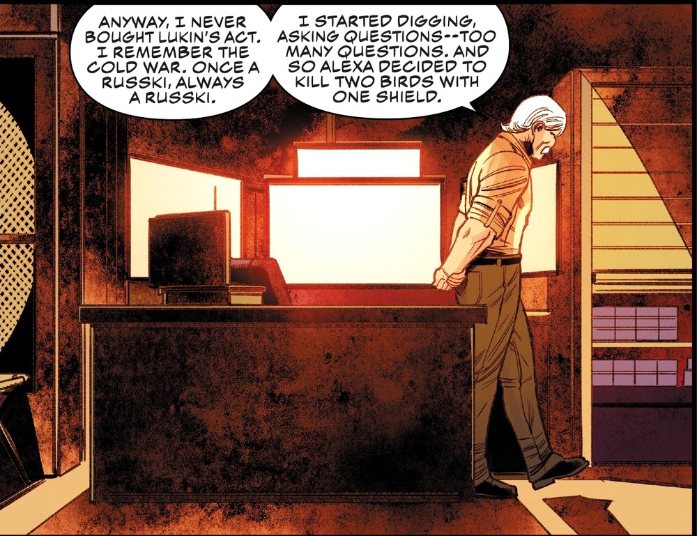 Иронично, что его идол в соседней серии подобной хернёй не страдает. Дошло до старого вояки, что вселенная Марвел включает в себя множество планет с разумной жизнью, магических измерений и многое другое. Очевидно, что в таком мире есть угрозы пострашнее Халка. Например, злые russkie.