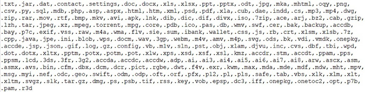 При активации вирус-вымогатель искал на компьютере файлы с размером меньше 2 мегабайт и шифровал их. Файлы размером больше 2 мегабайт с определенными расширениями — их список собран ниже — заполнялись случайным набором данных.