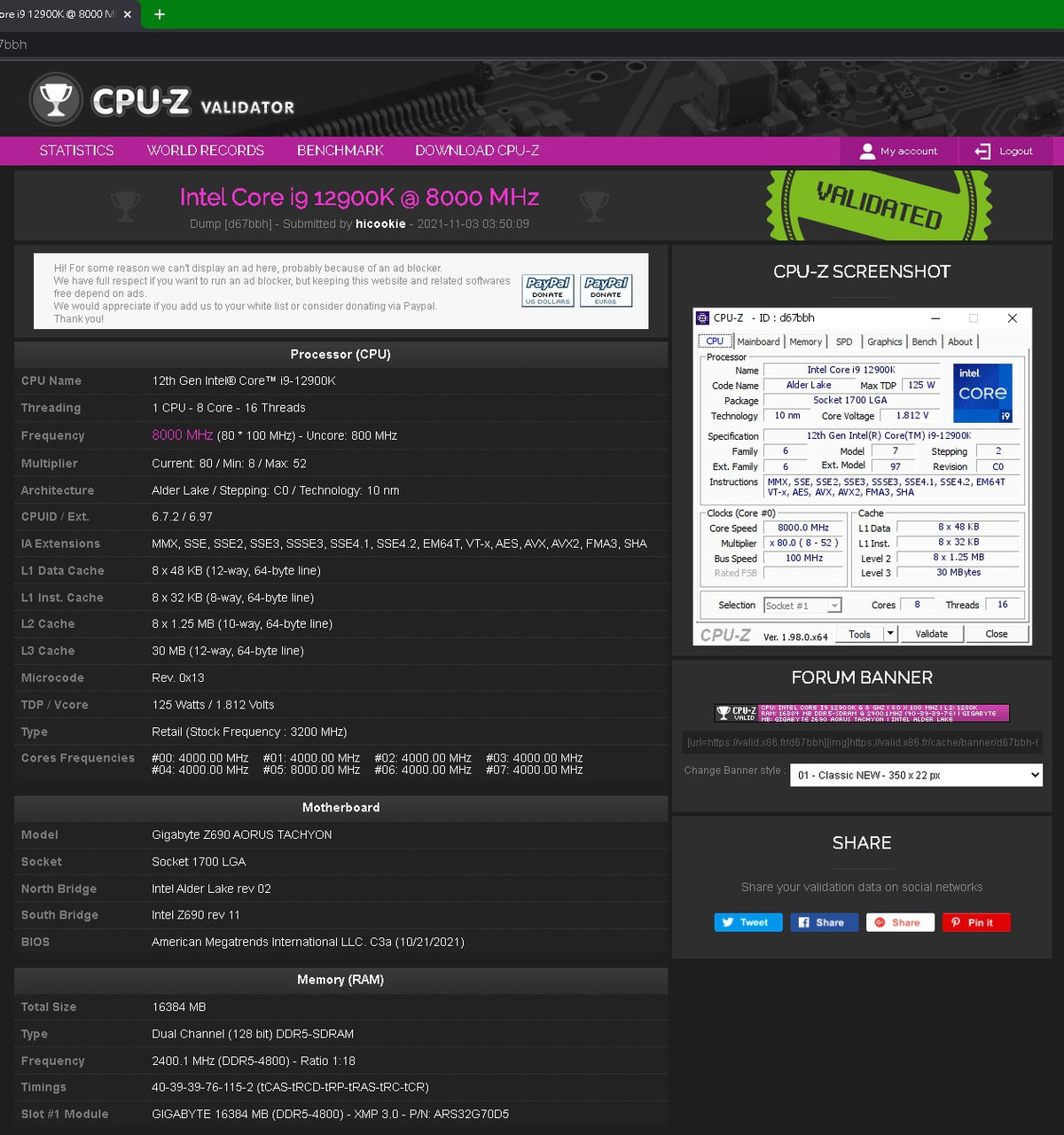 В конце октября оверклокер Аллен Голиберзах сумел разогнать новый процессор Intel Core i9-12900K до 6.8 ГГц. Неделю спустя его результат значительно улучшили: тайваньский оверклокер HiCookie сумел достичь частоты 8 ГГц.