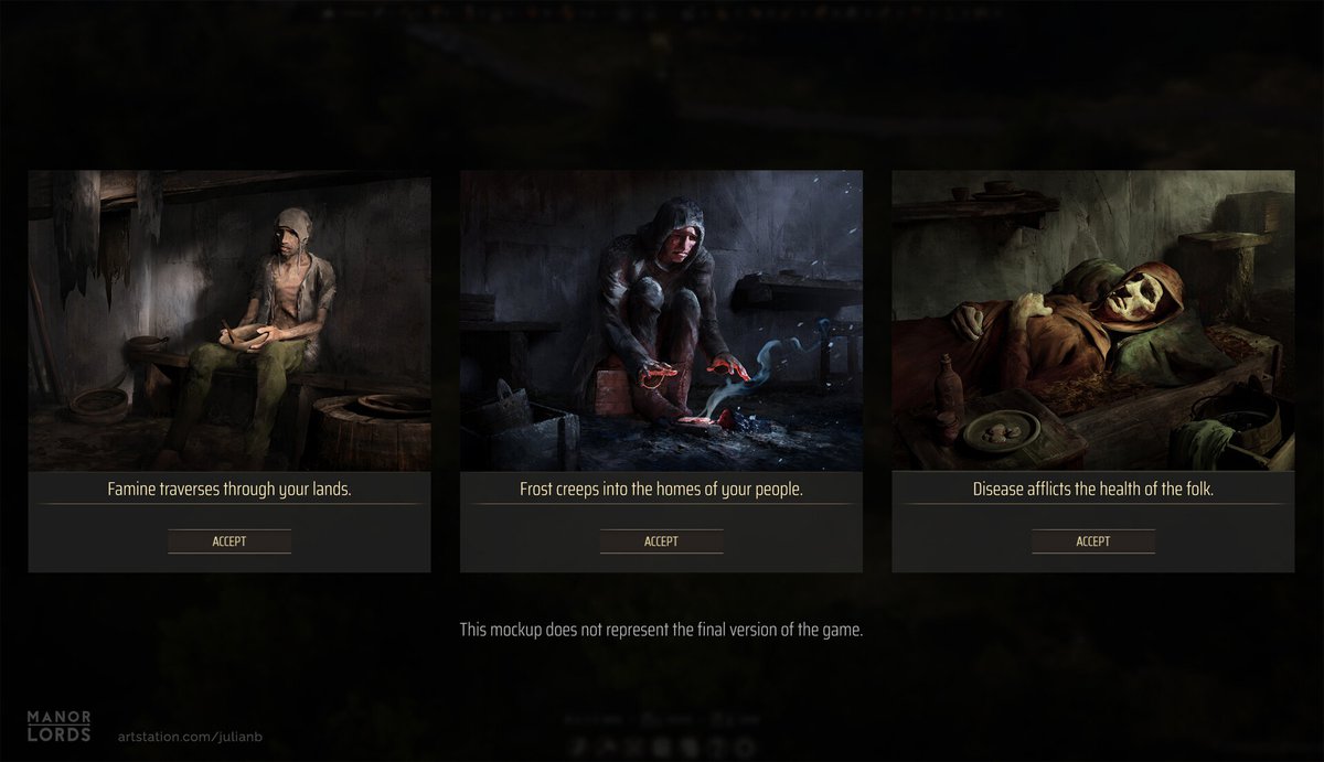 Пока таких событий три: холод, голод и болезни. Бауэр и разработчик Manor Lords Грэг Стикзен считают, что с помощью артов игроки смогут глубже погрузиться в атмосферу Средневековья.