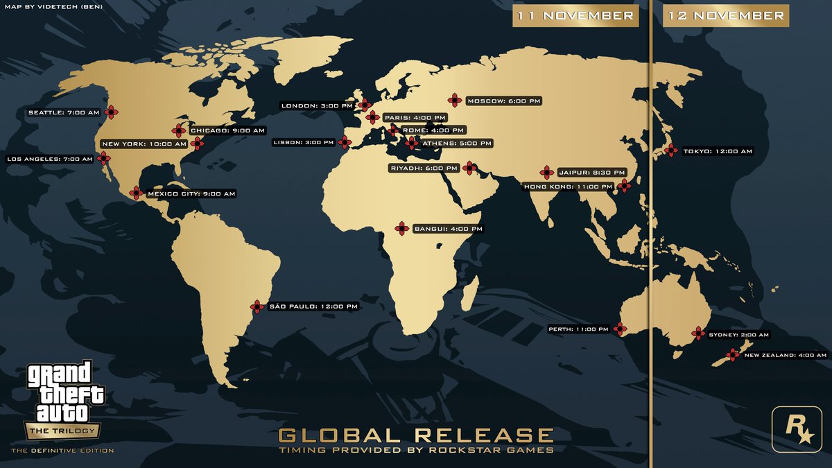 Rockstar Games выпустит ремастеры Grand Theft Auto The Trilogy – The Definitive Edition одновременно во всем мире. Компания опубликовала точную дату релиза на своем сайте: игры разблокируются 11 ноября в 18:00 по Москве.