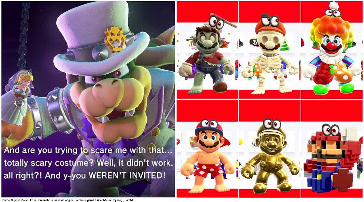 В вышедшей в 2017 году Super Mario Odyssey Боузер перед финальной битвой по-разному реагирует на облик Марио. Через 4 года после релиза фанаты выяснили, что существует 6 обликов, способных напугать монстра.