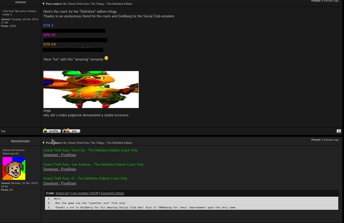 Примечательно, что защиту Grand Theft Auto The Trilogy почти одновременно смогли обойти двое хакеров. Из-за неких технических ограничений первый обход защиты работает только при запуске исполняемого файла самого ремастера, а второй — только через лаунчер.
