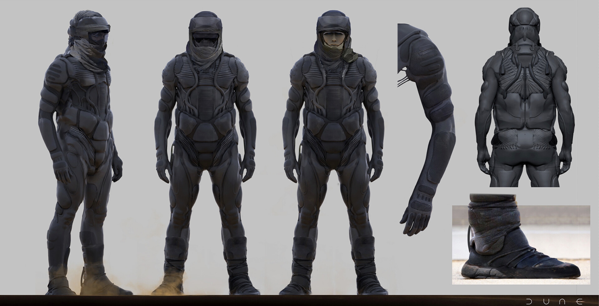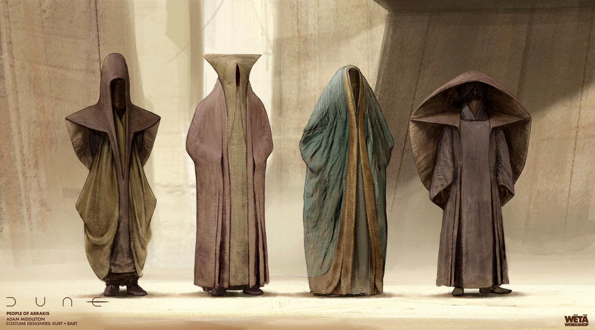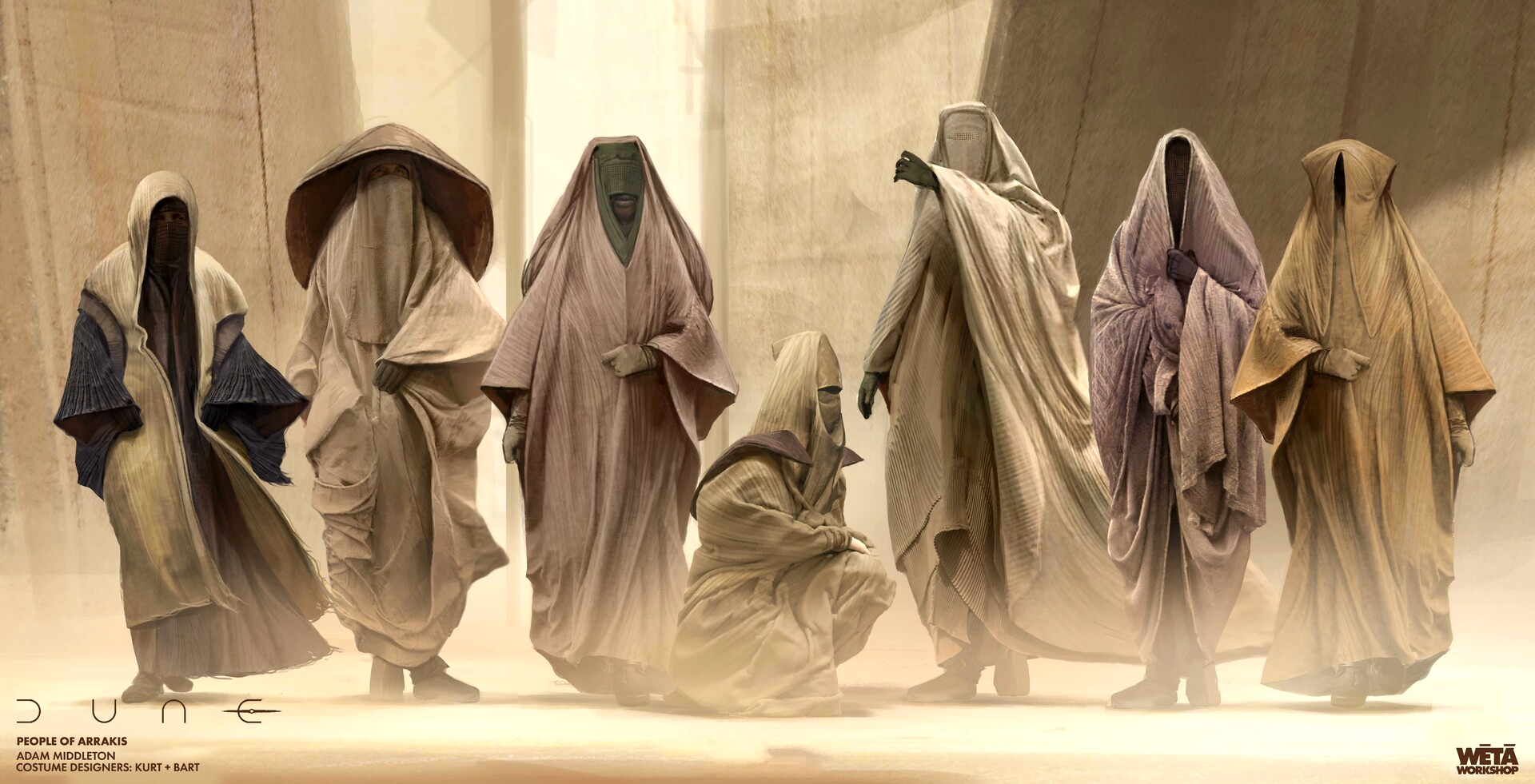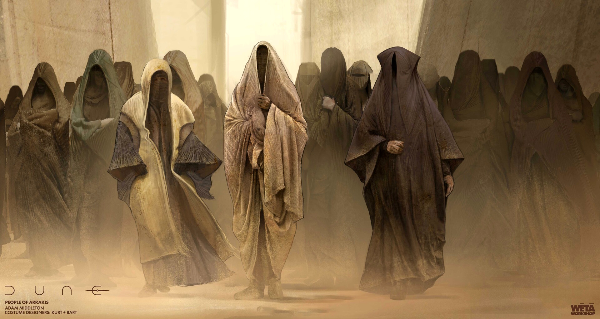 Если Атрейдесы носят тёмно-зелёный, Харконнены - чёрный, то жители Арракиса, соответственно, предпочитают песчаные оттенки. Дизайнеры брали за основу балахоны бедуинов, фильм Девида Лина «Лоуренс Аравийский» и типичную одежду, которую носят люди, допустим, в пустыне Сахара. Они с ног до головы укутаны тканью, что защищает от прямых солнечных лучей.