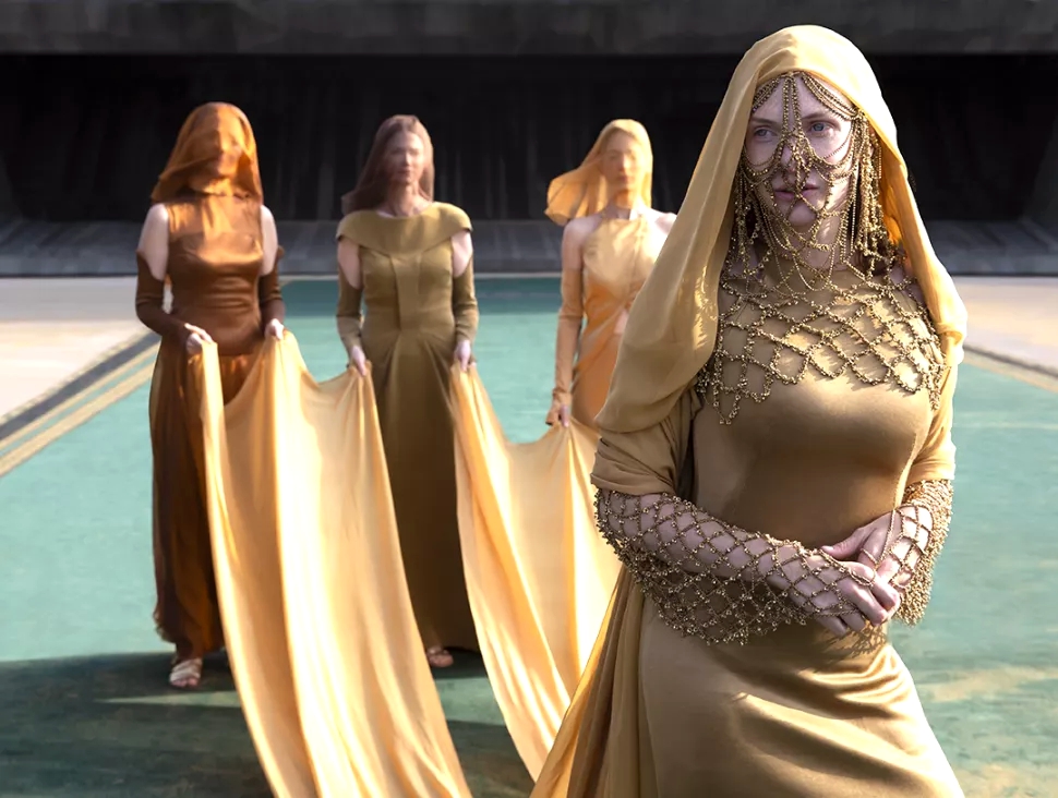 Самый яркий пример - это, наверное, золотисто-жёлтое платье леди Джессики. Покрывающие её голову цепи напоминают кольчугу, а вот модель платья позаимствовали у Balenciaga. Так как леди Джессика была не законной женой герцога Лето, а его наложницей, ей не было положено блистать ярким макияжем, замысловатыми причёсками и откровенными нарядами. А ещё она вышла из Бене Гессерит. От того платье её закрывает все участки кожи на теле и чем-то походит на то, что носят её сёстры по ордену. Местами чётко очерченный силуэт выражает её особое положение в обществе.