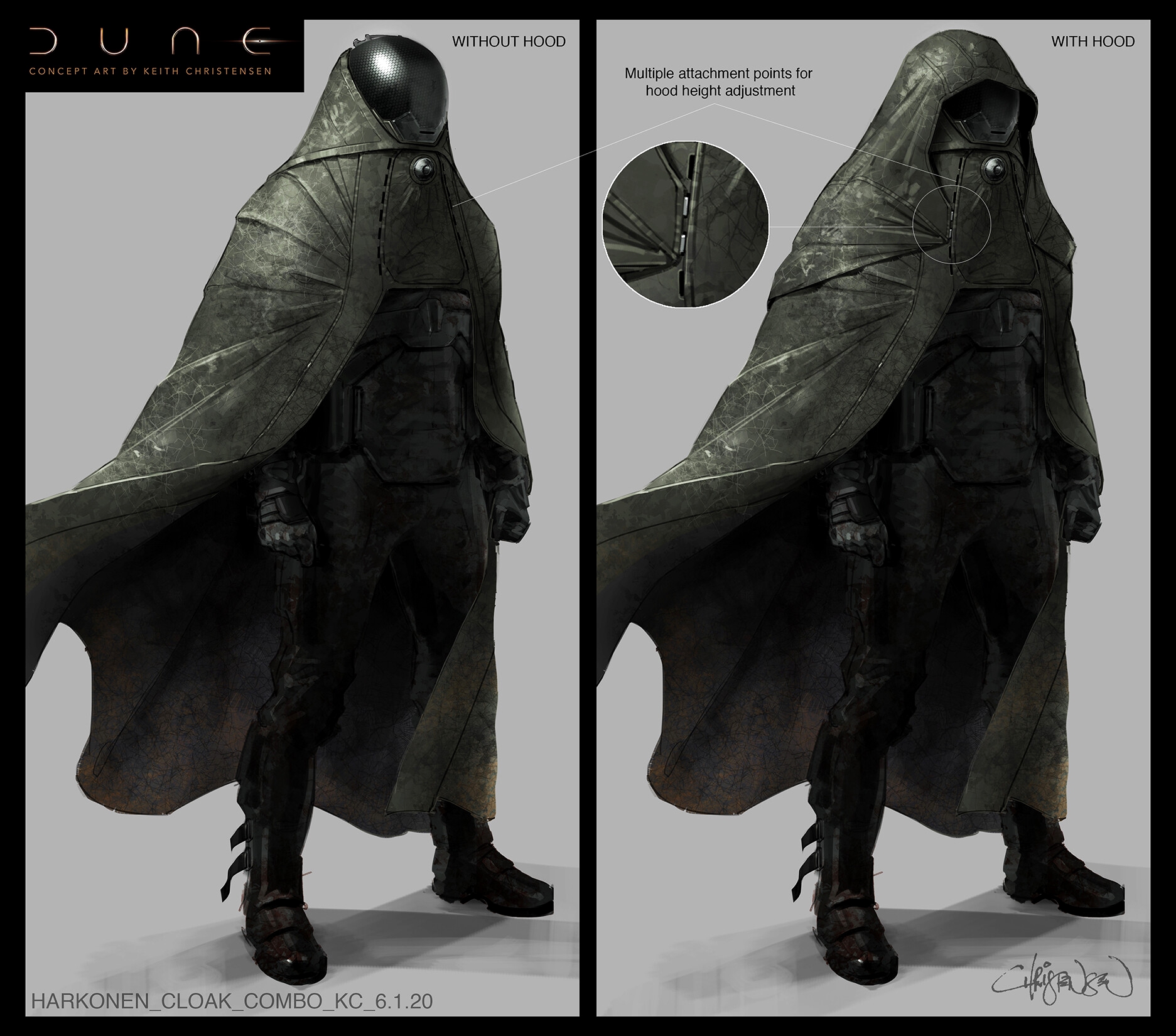 Как и в случае с Атрейдесами и Каладаном, костюмы Харконеннов создавались в соответствии с их планетой и историей рода. Гьеди Прайм - это достаточно тёмное и мрачное место. Да и сам глава дома - Барон Харконнен - жестокий, безжалостный и, как описывает его сам Герберт, «ужасно и безмерно толстый».