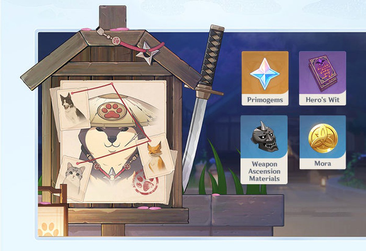 Новое событие, «Дело Бантан Санго: Пес-воин». Событие-расследование для игроков от 30 уровня. Придется разобраться, почему в Инадзуме начали исчезать мелкие животные, и восстановить справедливость, вызволив животных из плена.