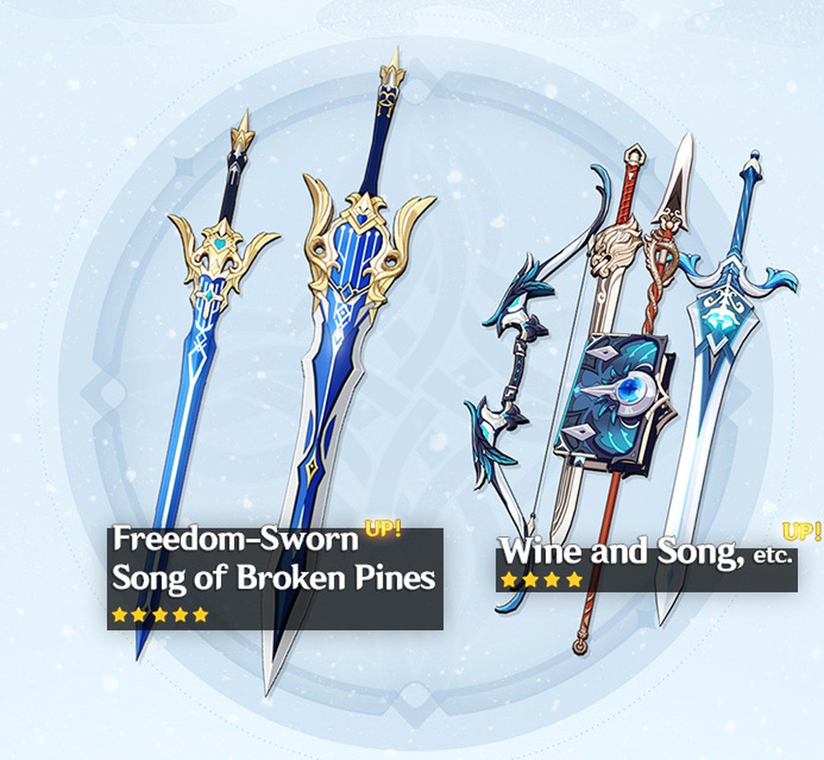 Баннер оружия работает как обычно: будут повышены шансы на получение Клятвы свободы, Песни разбитых сосен (по 5 звезд редкости), а также Драконьего рыка, Вина и песен, Грозы драконов и Церемониального двуручного меча (по 4 звезды).