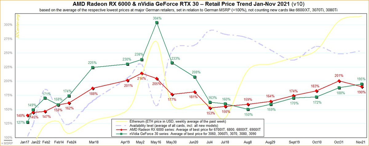 Согласно данным 3DCenter, наценка на видеокарты Nvidia и AMD сейчас примерно одинаковая: 195% и 190% соответственно. Цены устойчиво растут с июля-августа, в случае с картами AMD они близки к максимальным.