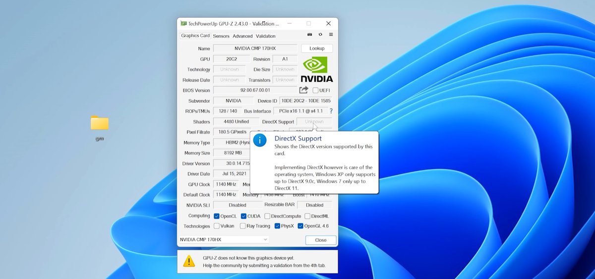 Во-первых, для CMP 170HX не существует драйверов. Во-вторых, Nvidia убрала у ускорителя поддержку Vulkan, DirectML, DirectX и трассировки лучей. Хотя GPU-Z и сообщает о поддержке OpenGL, на самом деле она тоже не работает.