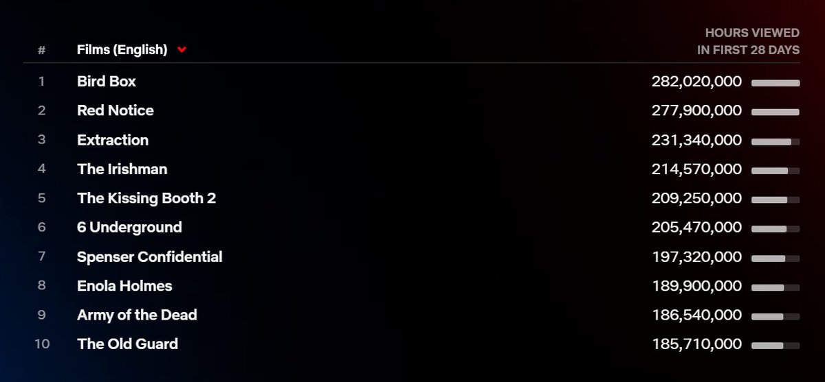 Собственный чарт Netflix все еще возглавляет «Птичий короб»: за первые 28 дней на просмотр этого фильма потратили 282.02 миллиона часов. Но «Красному уведомлению» удалось потеснить «Операцию по спасению» и выйти на вторую строчку с 277.9 миллиона часов.
