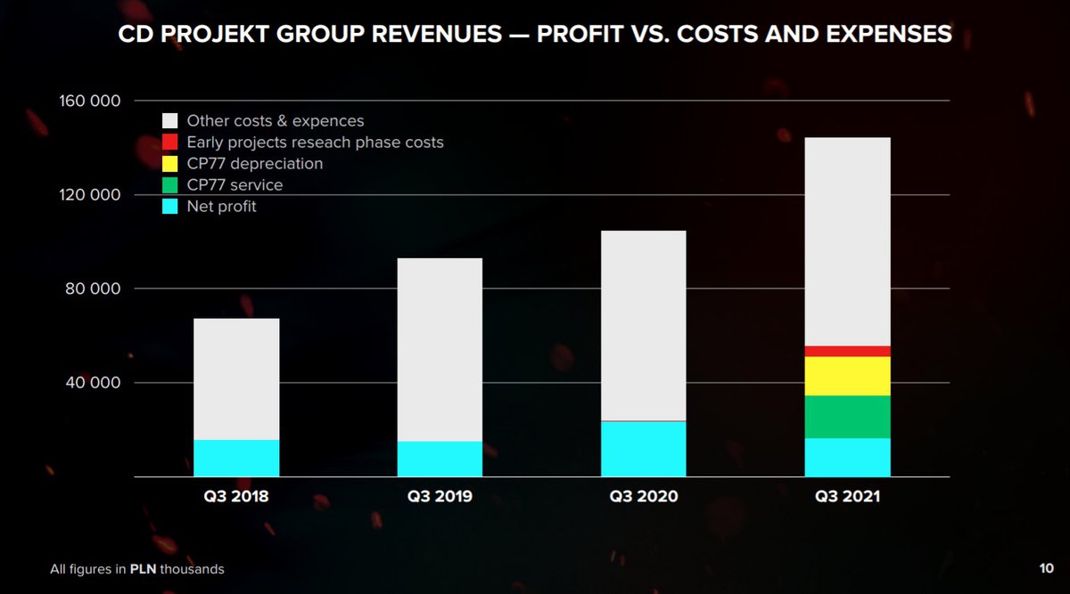 Холдинг CD Projekt опубликовал отчет за квартал, закончившийся 30 сентября 2021 года. Выручка компании составила $34.6 миллиона против $25 миллионов в том же квартале прошлого года, операционная прибыль равна $3.7 миллиона ($6.8 миллиона годом ранее).