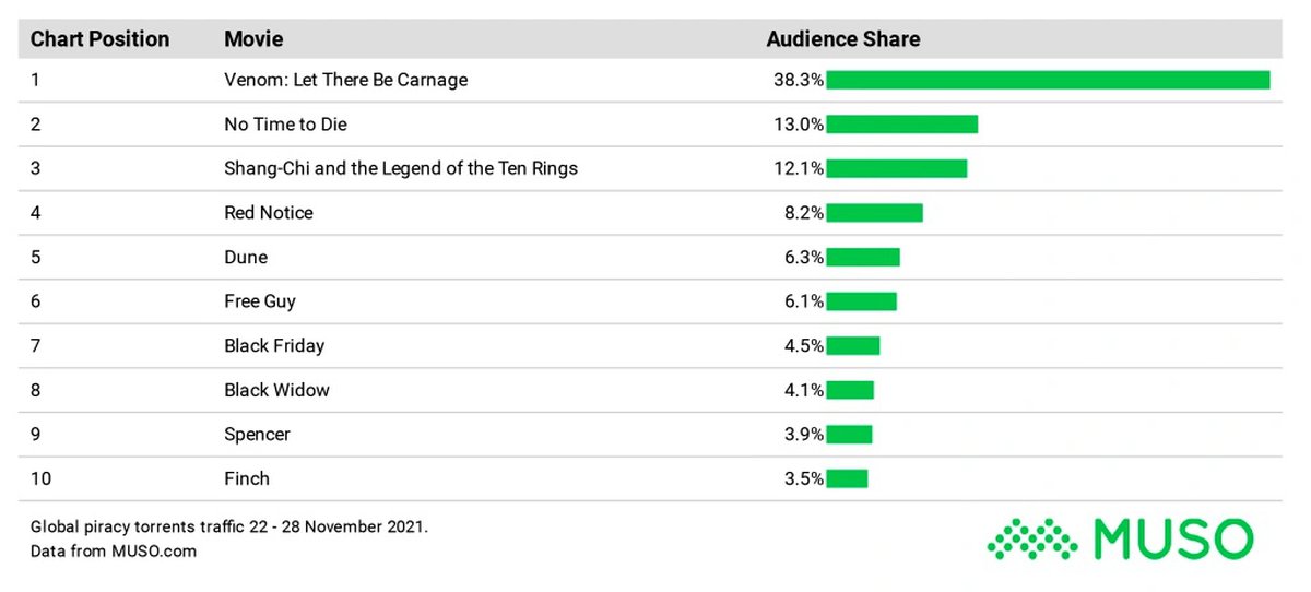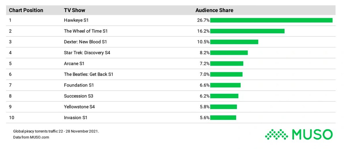 Аналитики MUSO выпустили отчет о фильмах и сериалах, пользующихся большой популярностью на торрентах. Среди фильмов лидирует «Веном 2», среди сериалов — «Соколиный Глаз».